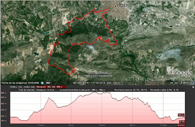 Las dos primeras: Melocotón y Oliva son circulares con 8,97 Km. de distancia y 508 m. de desnivel acumulado, la primera y 14,3 Km. de distancia y 585 m. de desnivel acumulado, la segunda. Se inician y acaban en Cieza transitando por las riberas del río Segura, la huerta tradicional y el cercano monte de la "Atalaya" con su reconocido yacimiento arqueológico "Siyäsa".