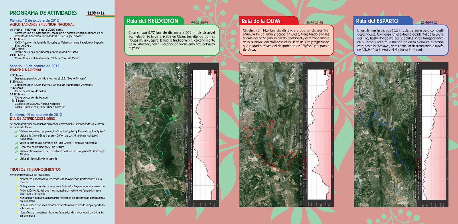 - 9:00 a 14:00 y de 16:00 a 20:00 horas. Formalización de inscripciones, recogida de dorsales y acreditaciones, revista oficial de información sobre Cieza y obsequios conmemorativos a todos los participantes, en el I.E.S. “Diego Tortosa”.